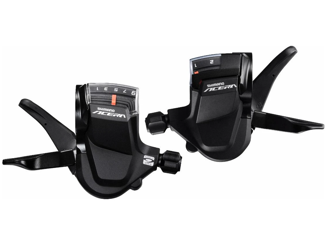 The Shimano Acera SL-M3010 shift lever set is compatible with 2×9 speed drivetrains, and is great for entry-level mountain biking.